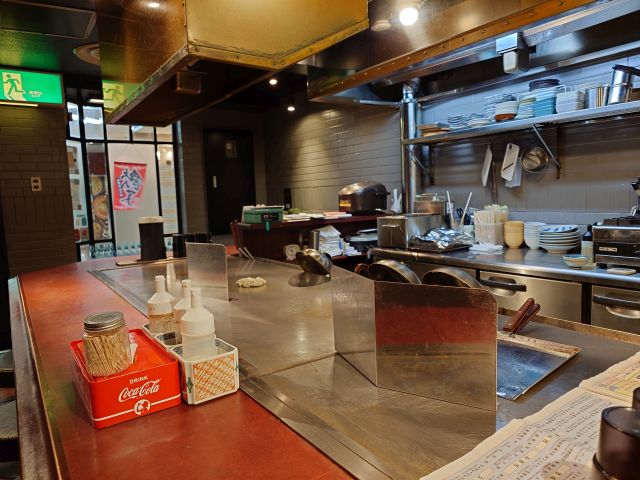 店内は奥に長い構造、大きな鉄板が奥にのびます! 席はカウンター席オンリー、12時頃の訪問で先客さんなしです。
