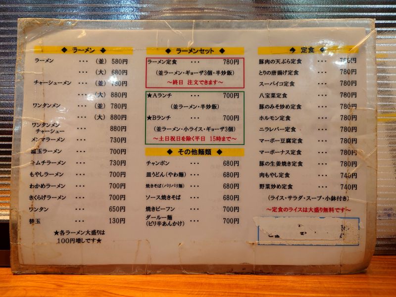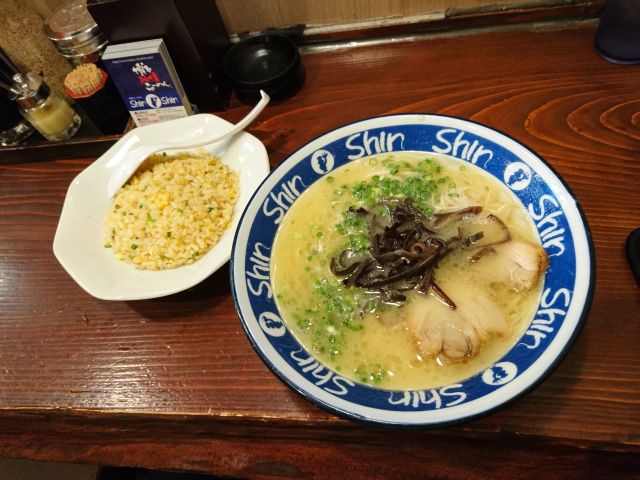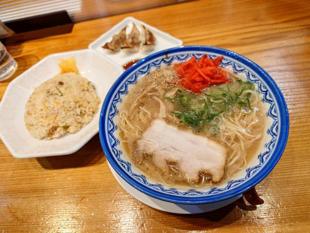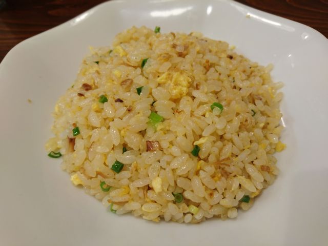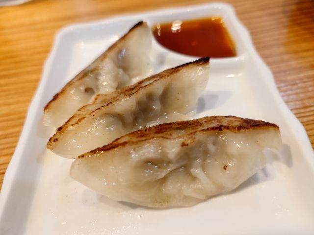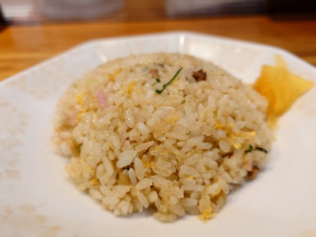 半炒飯は定番の味わいですね、パラパラ系でラーメンのお供に最適。餃子は中サイズが3個、具材は少なめで皮薄め、シナっと感のある西日本餃子です。