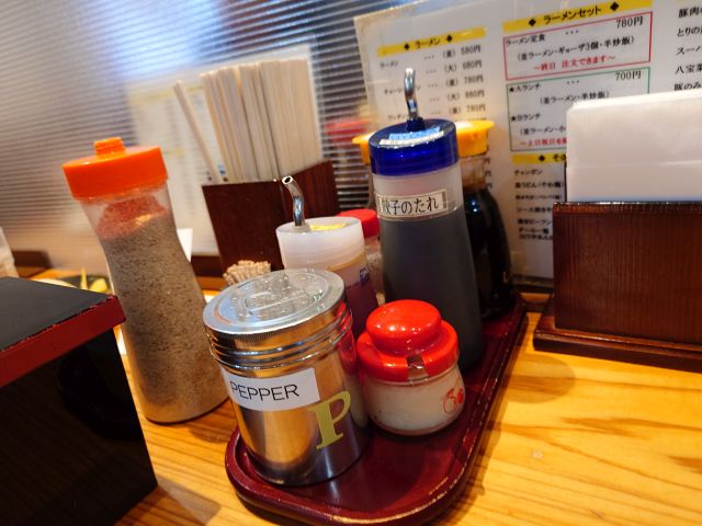注文は「ラーメン定食(780円)」、先に炒飯と餃子、2分ほど遅れてラーメンの登場、混んでいても提供は早いですね。卓上の紅生姜と白ごまを投入します。