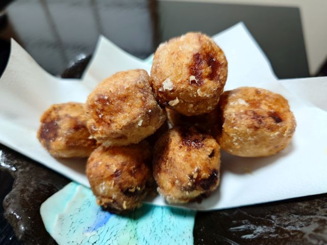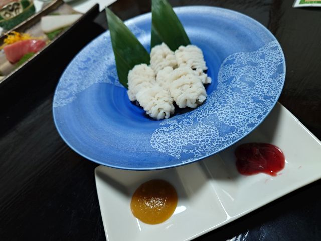 鱧湯引きは酢味噌と梅肉で頂きます、シーズン終盤ですが淡白な身は夏の恵みです。里芋は揚げたて熱々、丸ごとひとつを口中に入れて大変なことになりました^^; ゲソ焼きは香ばしい味わい、暑いうちが美味しいのでサクサク頂きます。この辺りで三岳水割りにチェンジです。