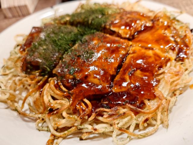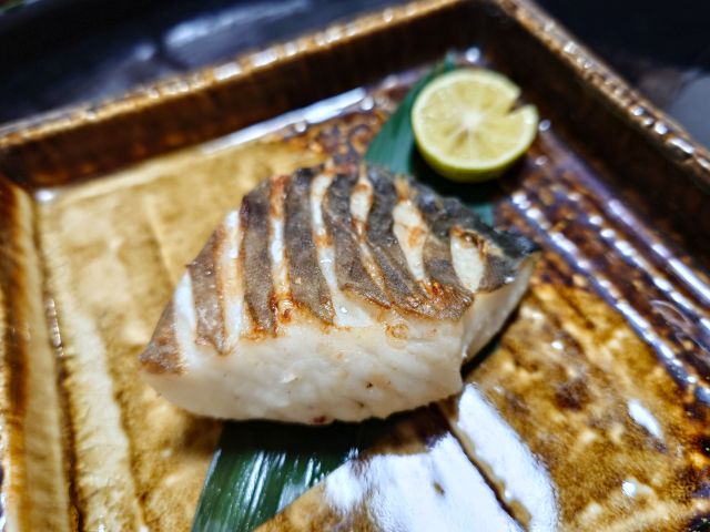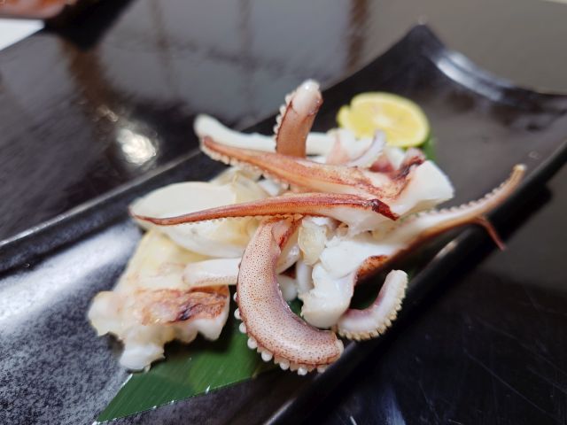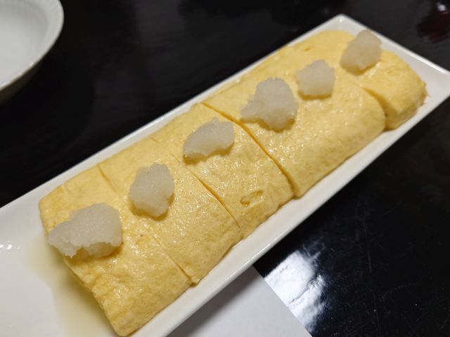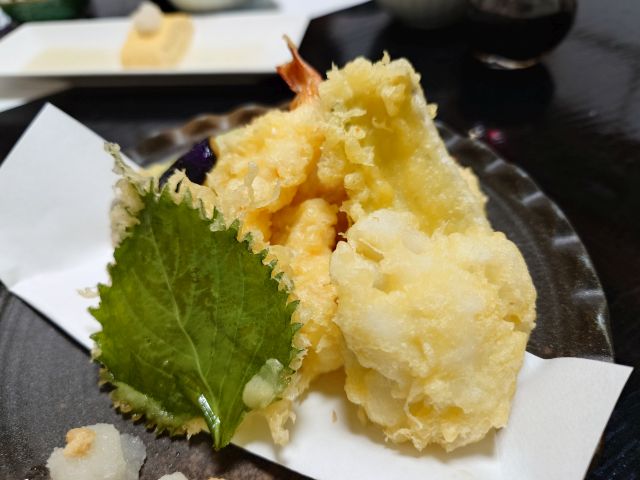 焼き真魚鰹は厚みがあって食べ応えあります、独特の甘みと旨味がしっかりで焼酎が進みます。だし巻きは細長サイズが一本、上には大根おろし、焦げ目のない見事な形状に感動です。天ぷらは海老と季節野菜、衣が薄く素材を活かす仕上がり、梅酒ロックが進みます。