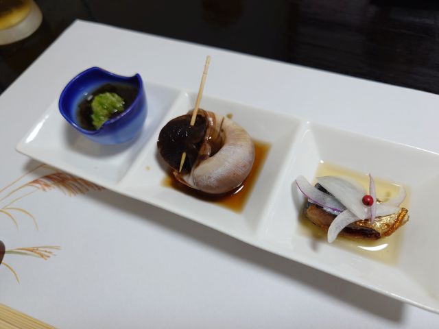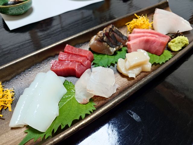 生ビールで乾杯、突出し3種をアテに喉を潤します、大きな貝は濃厚な味わいです。刺盛りは7種、甘い烏賊と脂乗りの良い中トロが特に美味です。
