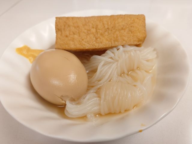 限られた時間なのでサクッと頂きましょう、焼酎湯割りに梅干しを入れて頂きました、寒い時期には最高ですね! おでんは厚揚げ・玉子・しらたき、早い時間帯なので煮込まれていませんが出汁は好きなタイプです。コンビーフオムレツは焼き立て、サイズはかなり大きいですね。コンビーフの香ばしさと玉子の甘さがいい感じで調和しています。