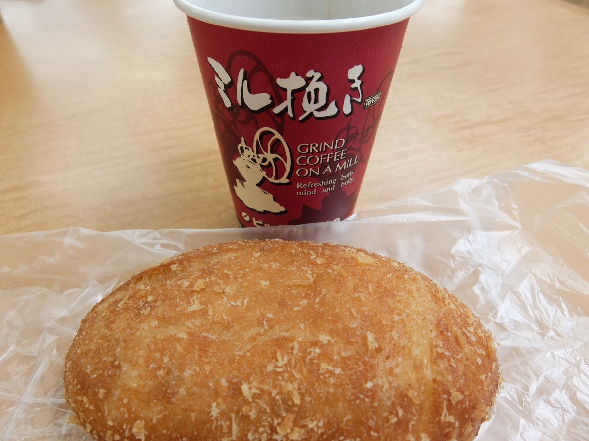 三木サービスエリア(上り)は阪急阪神ホテルズが運営されています。レストランも評価高いですが、時間は10時前ですのでSAに入っている「宝塚ホームベーカリー」さんで小腹を満たすべくパンを買い求めました。目立つ場所に陳列されている「三木カレーパン(206円」と「おつまみグリッシーニ(106円)」を購入、きっとお薦め商品なのでしょう。ベンダーコーナーで”世界初”の看板が目立つ自販機でアメリカン・コーヒー(250円)を買ってテーブルコーナーへ移動。