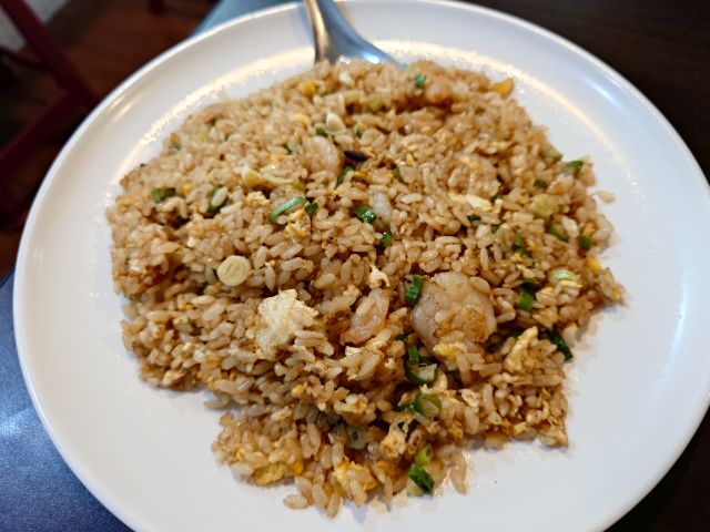 蝦仁炒飯はパラパラですね、濃いめの味付けは醤油系ダレでしょう、具材は海老・卵・青ネギ、米粒がシャキッとしてかなり好みの味わいです。
