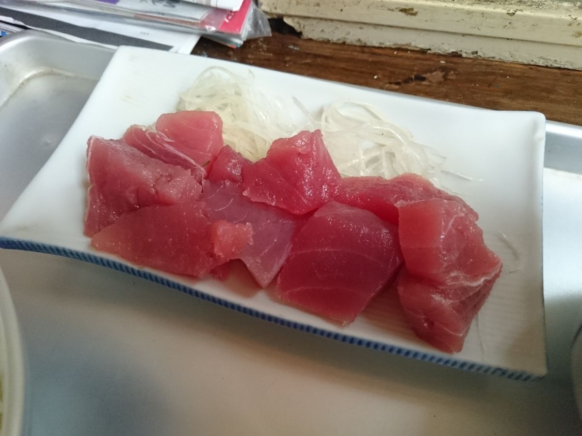 皆さんお勧めのぶつ定食(650円)を注文、待つこと4~5分でやって来ました。アルミのフチありトレーに載せられたまぐろぶつと小鉢、わさびの量がしっかりあるのが嬉しいですね。醤油をしっかり注ぎ、ぶつを浸して頂きます、うん美味いです!!。新鮮なマグロを白ご飯で頂くと夏バテも吹き飛びます。小鉢のきんぴらごぼうと漬物2種も間違いない味付けです。