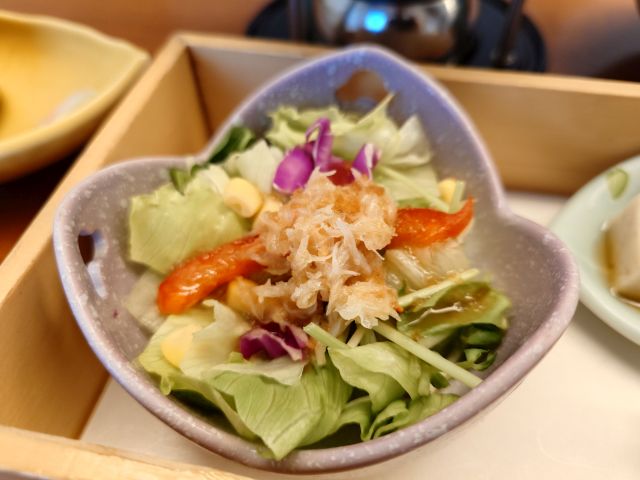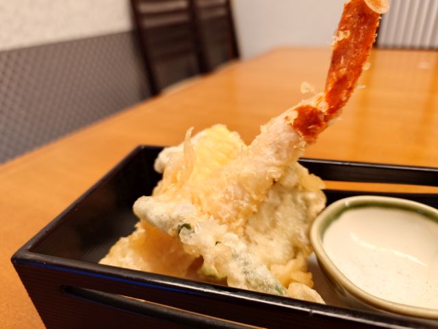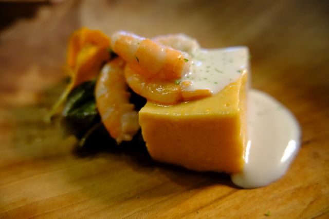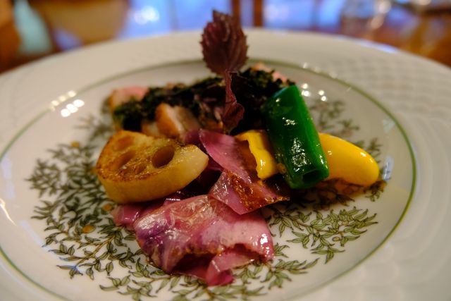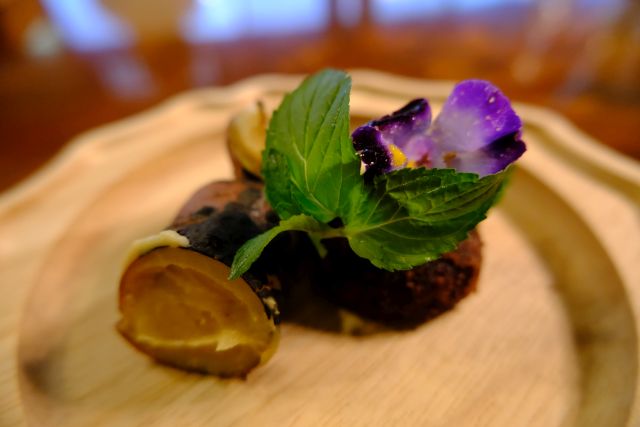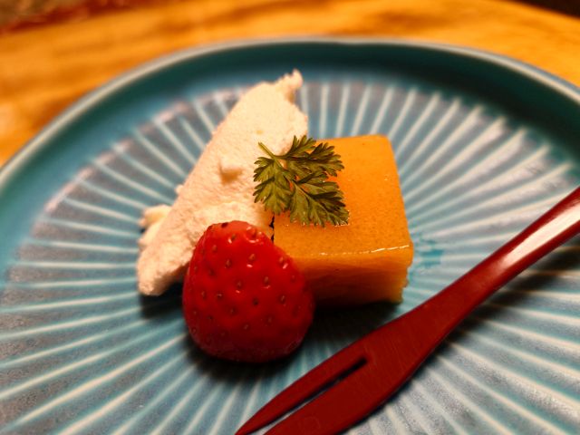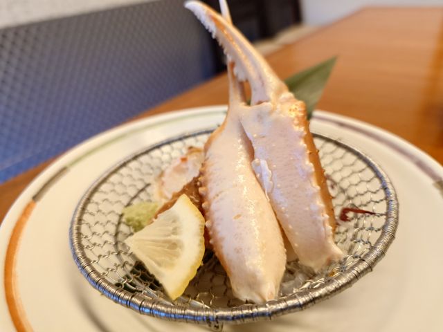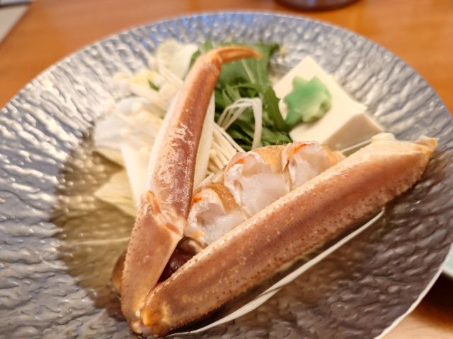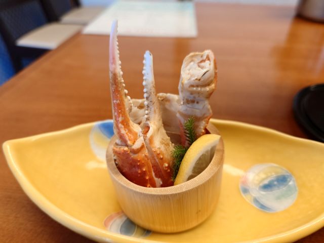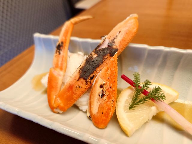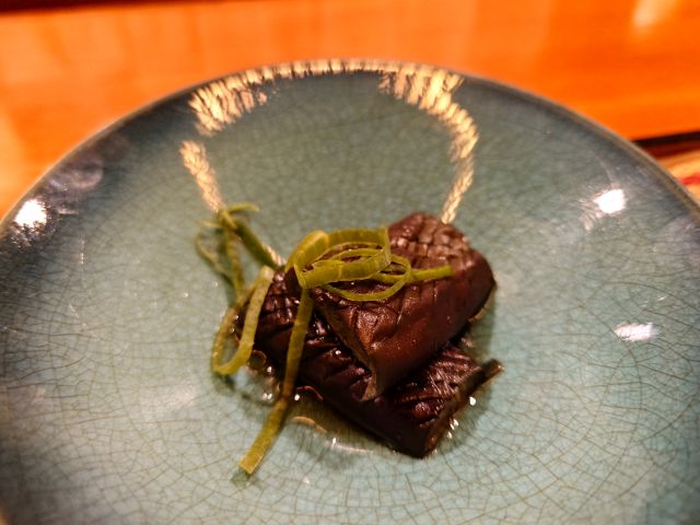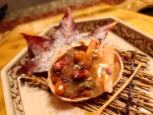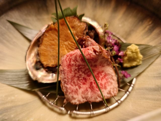 ローストビーフは蒸し鮑との組み合わせ、新鮮な山葵で頂くと至福のひととき、鮑は蒸されてしっとり食感でした。香箱蟹は黒毛和牛とセットで頂きます。蟹風味に包まれた和牛も美味しいですね、外子と和牛の組み合わせは全く違和感ありません。この辺りで佐藤 黒(芋)の湯割りにチェンジです。