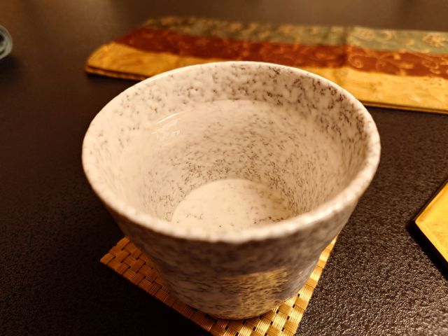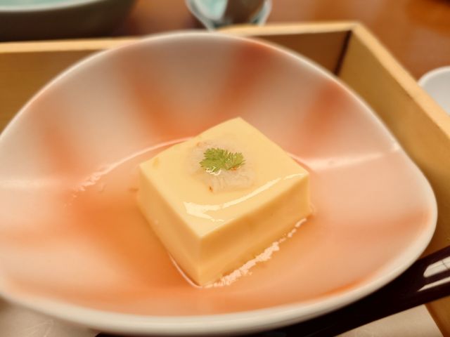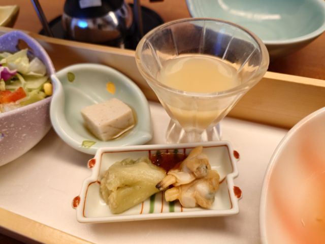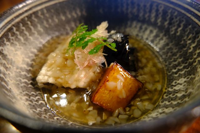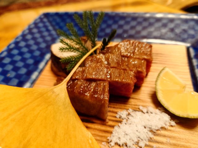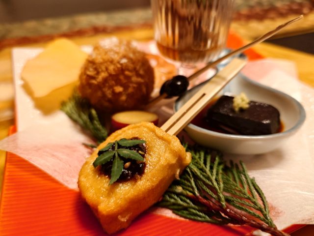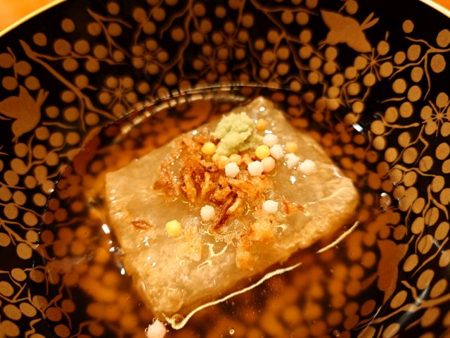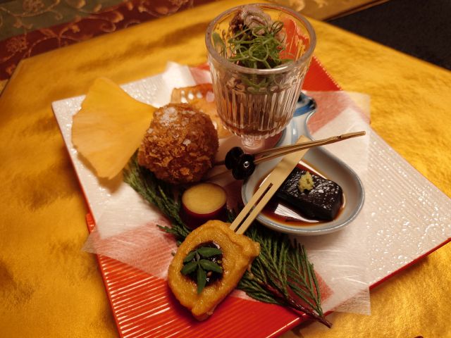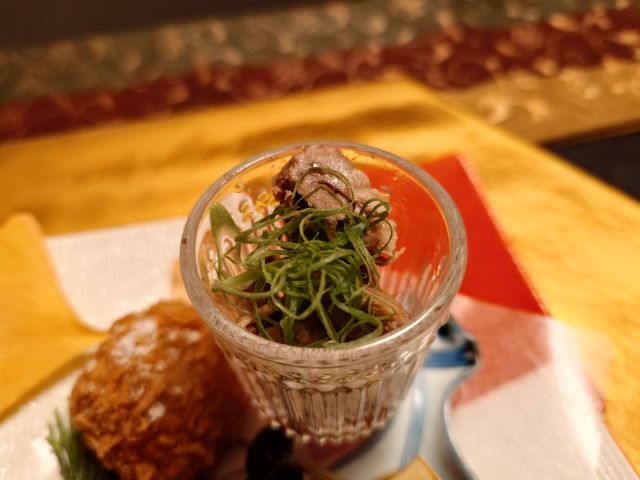 富乃宝山ロックで乾杯、八寸の先附を頂きましょう。見事な酒アテですね、盛りも素晴らしいです。球状の牛カツは肉の旨味を閉じ込めています、牛すじ煮込みも軟らかく滋味深いですね。椀物は黒毛和牛スライス、シャキッとしたネギは上質、レベルの高い汁物です。