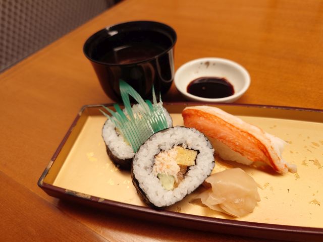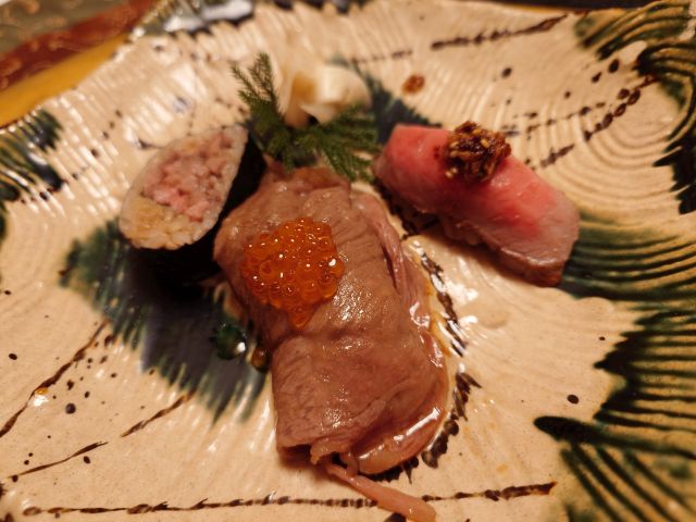 炭火焼きは備長炭仕様、黒毛独特の旨味を閉じ込めていますね、ジューシーさもあって最高です。食事は肉寿司3種、趣向を凝らした3品はどれも美味しいですね、イクラと和牛の組み合わせはお初ですがこちらも見事でした^^