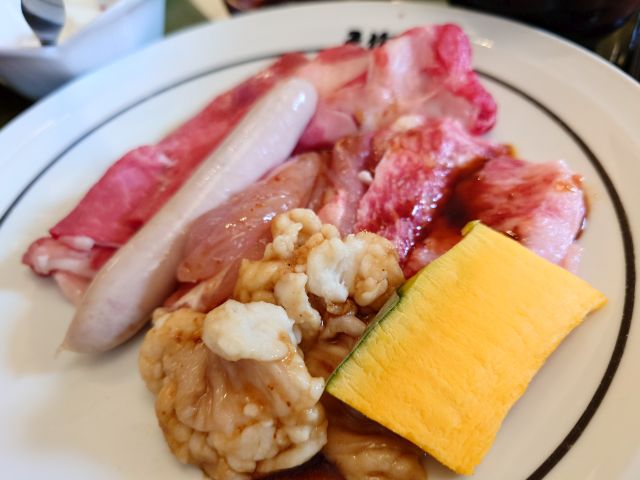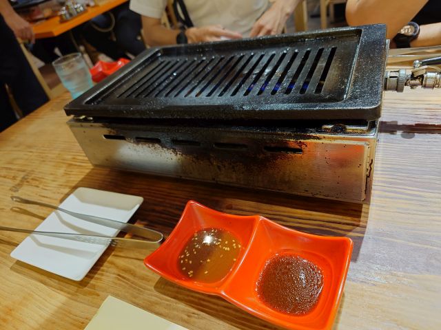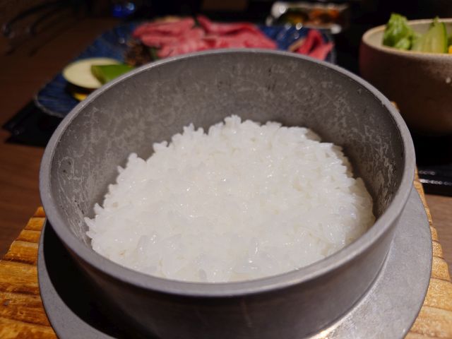 おかやま和牛4種はカルビ・肩ロース・赤身・イチボ、どれも上質な色合いですね、早速ガスロースターで焼きましょう。カルビは甘みを感じる脂がグッド、肩ロースは霜降り度が素晴らしいです。イチボは部位特有の柔らかさがありますね、赤身はバランスのいい味でした(*^^*) 釜炊きご飯は炊きたて艶々ですが少し軟いですね、もう少し硬めが好みです。