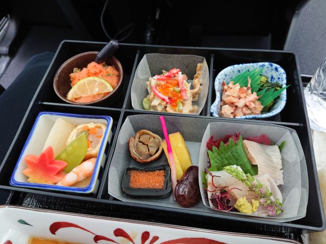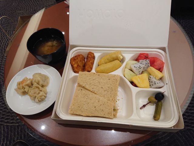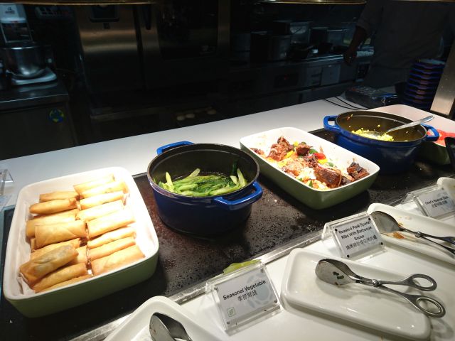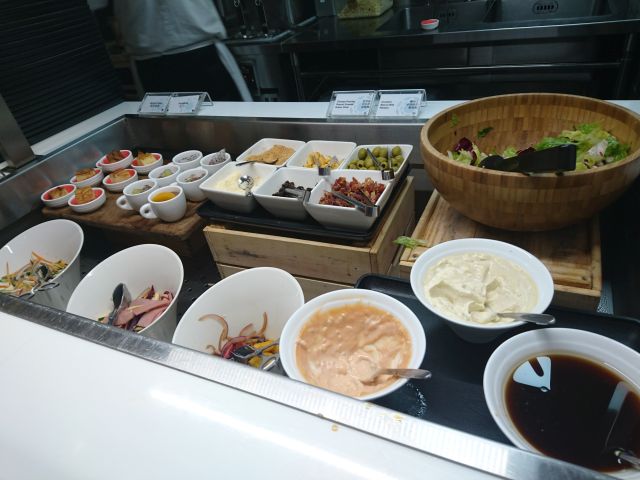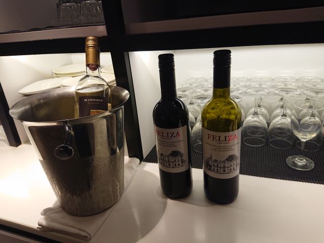 ビュッフェコーナーの料理はそれほど多くないですね、アルコールもワインだけなのかな? 空港から車で帰りますのでワインは諦めます!