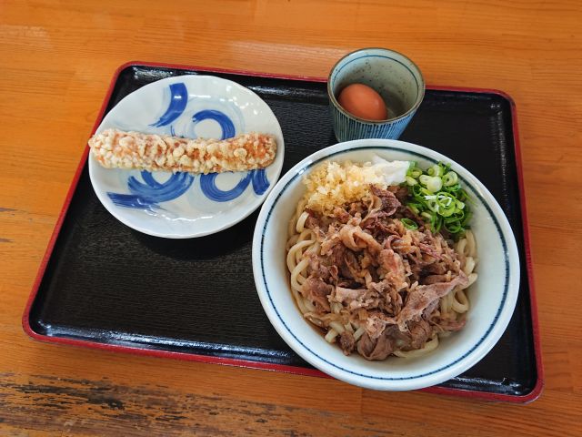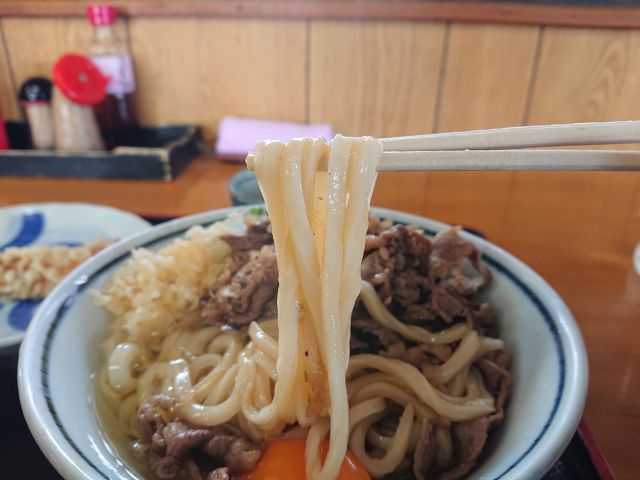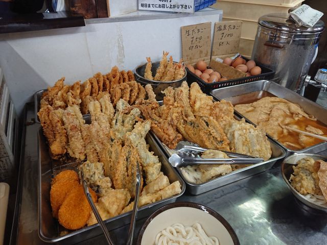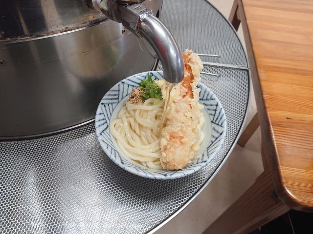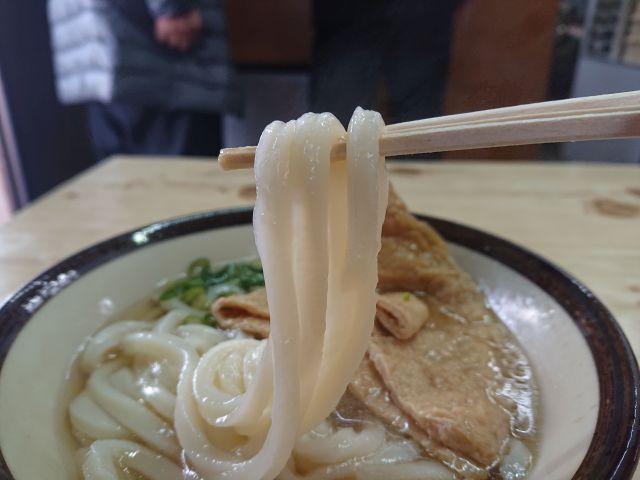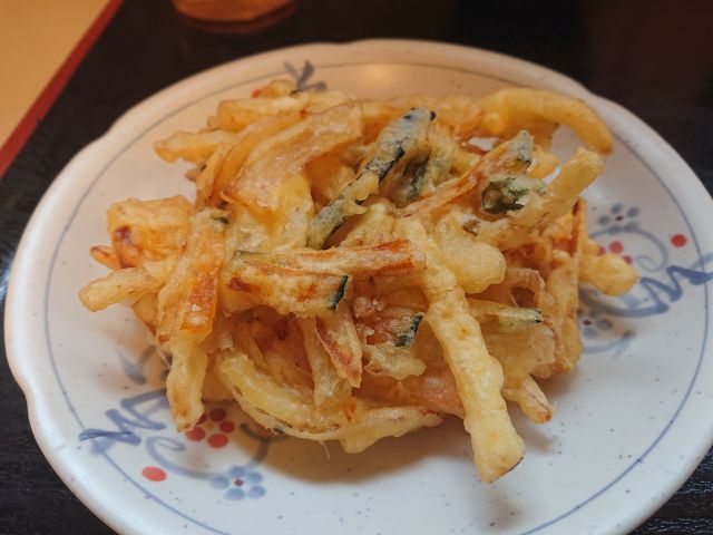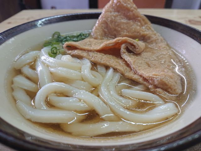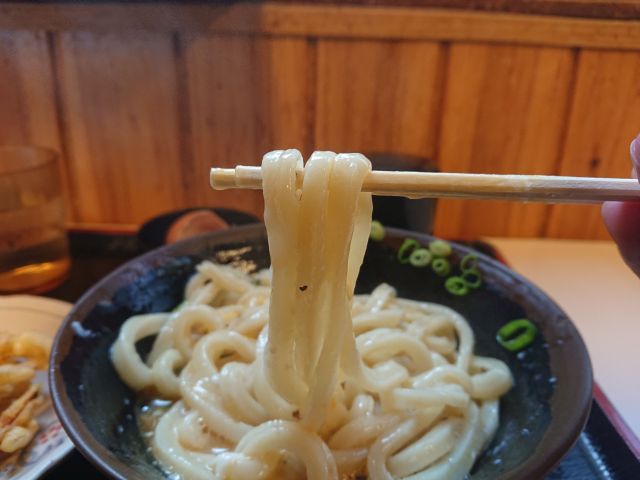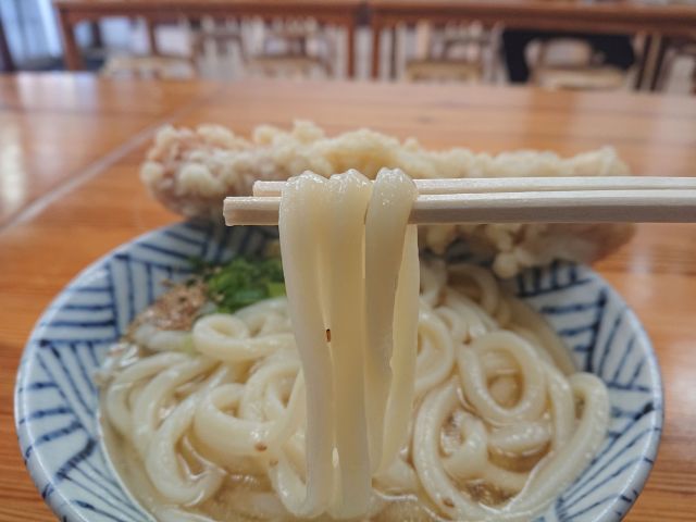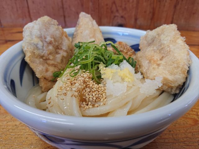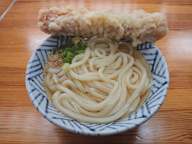 うどんは適度なコシを保ちながら弾力もあります、ぶっかけなので表面のねっとり感も楽しめます。出汁はあっさりで最初から全部掛けても問題ないですね、カツオベースで若干薄く感じました。かしわ天はでかいです、4切れの塊ですから食べごたえありますね。外はカラッと揚がっていますが中はジューシー、鶏肉本来の旨味をしっかり堪能しました。