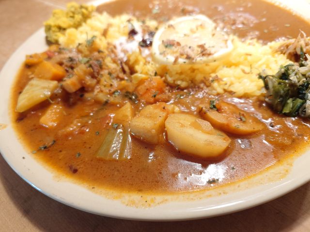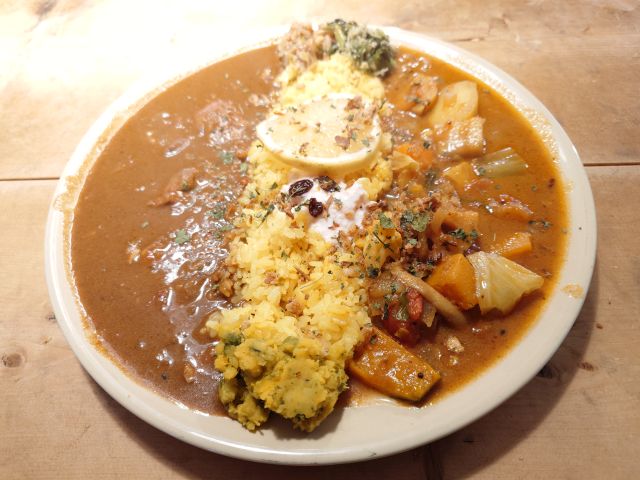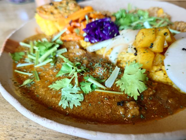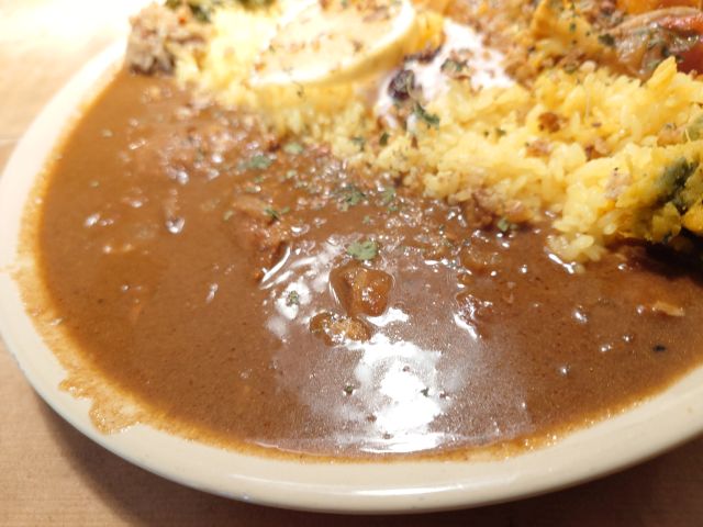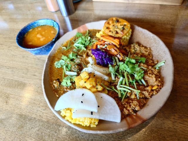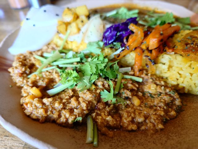 右は和出汁チキンカレー、節系を含む和風出汁で優しい味わいですね、鶏肉も大きめです。和出汁とスパイスの両立はバランスが重要だと思いますが完成度かなり高いと思います。左がドライキーマカレー、大粒のひき肉で食べ応えあります。豪快で肉肉しいキーマカレーですが檸檬を絞るとさっぱり頂けますよ、お勧めです。