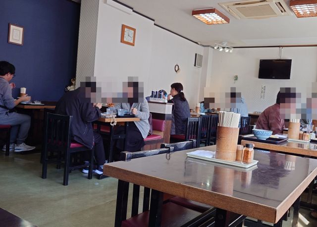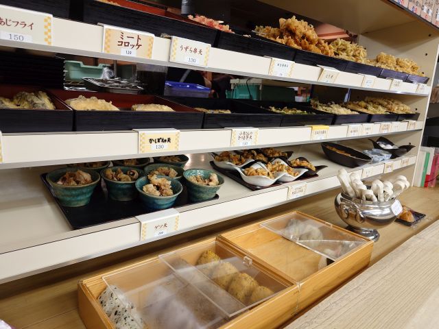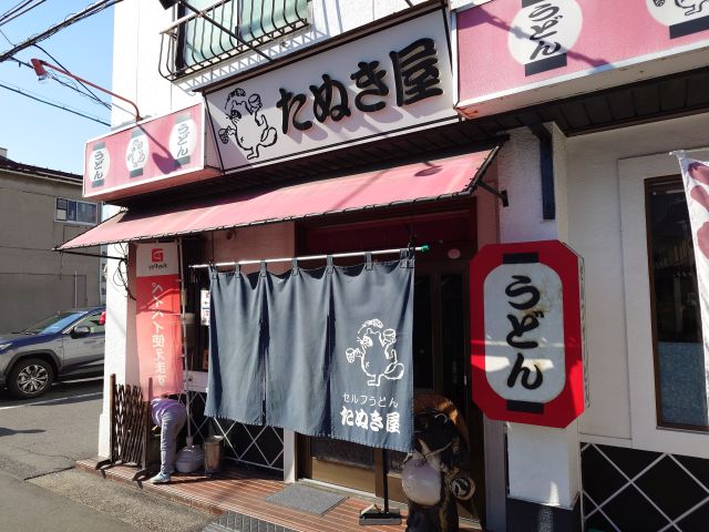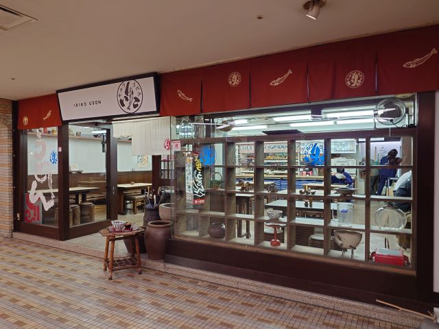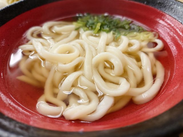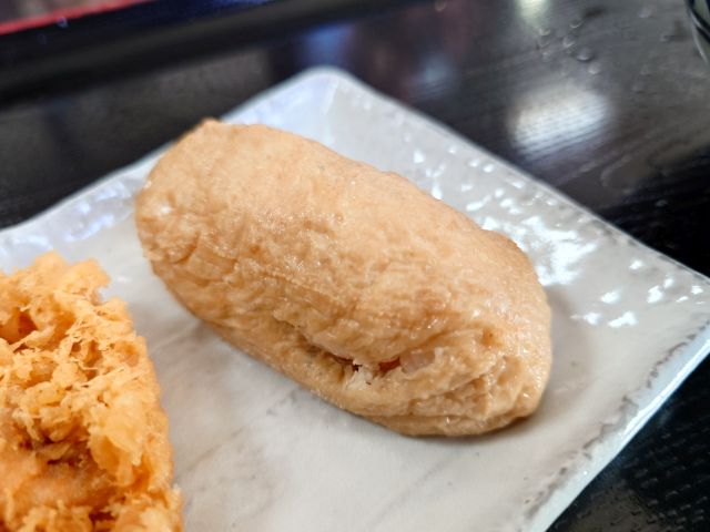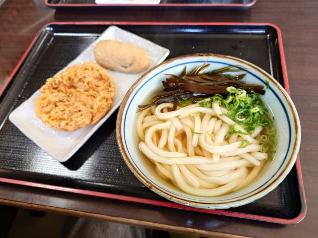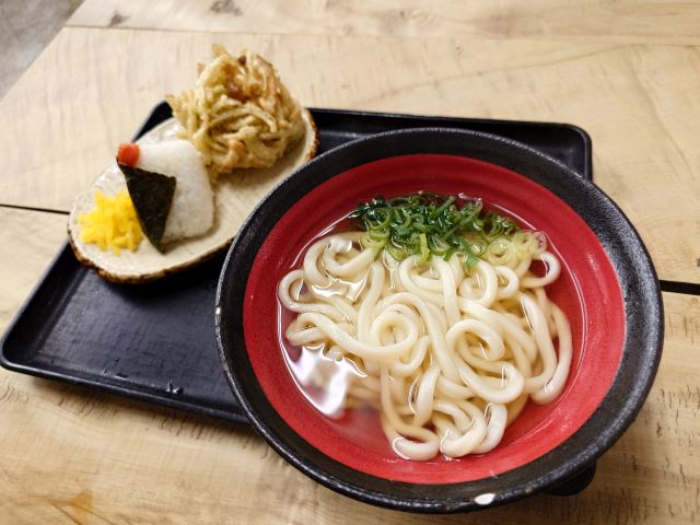 セルフレーンでうどんを注文&受け取り、天ぷらとおにぎりを取って会計、薬味を投入して出汁を注ぐ手順になります。入口付近のテーブル席で頂きましょう。