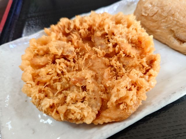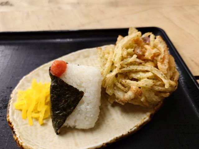 おにぎりは明太子仕様、中にもたっぷり明太子が入っています。見た目より重量感あって食べ応えあります。かき揚げは玉ねぎ&ちくわ磯辺揚げ片...この組み合わせは初めてですがあっさりで良かったです。