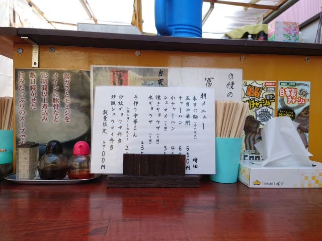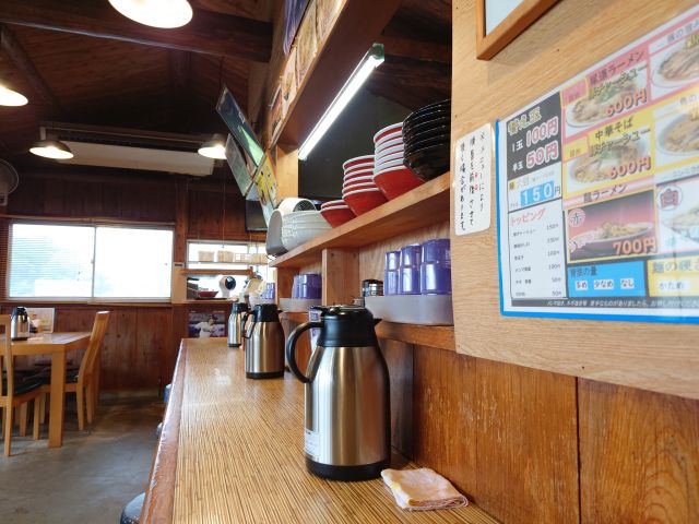 店内は奥に長い空間、カウンター席とテーブル席、入ってすぐは厨房になります。メニューは現在ラーメン2種とうどんになります。