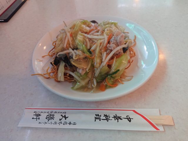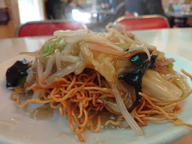 野菜たっぷりの餡は濃いめの味わい、カラッと香ばしく揚がった焼きそばとの相性も良いですね、時間が経ってもしっかり食感のそばは美味いです。大きめの海老剥き身・うずら卵も入って上質なかた焼きそばでした(*^^*)