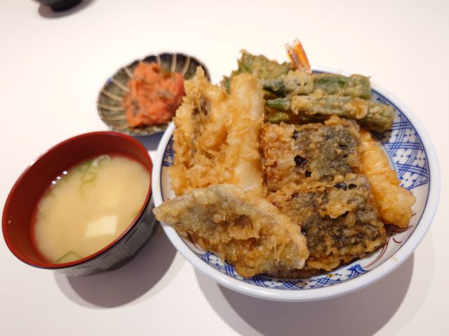 揚げ立てですが天種をタレ壺に漬けますので衣はしんなりした状態での提供となします、海老天は中サイズですが3尾あるので食べ応えあります。野菜は大きめ、甘い南瓜とピーマンが好みの味わい、ご飯量は多めなのでめかぶ明太子が進みますね、味噌汁は蜆仕様でした(*^^*)