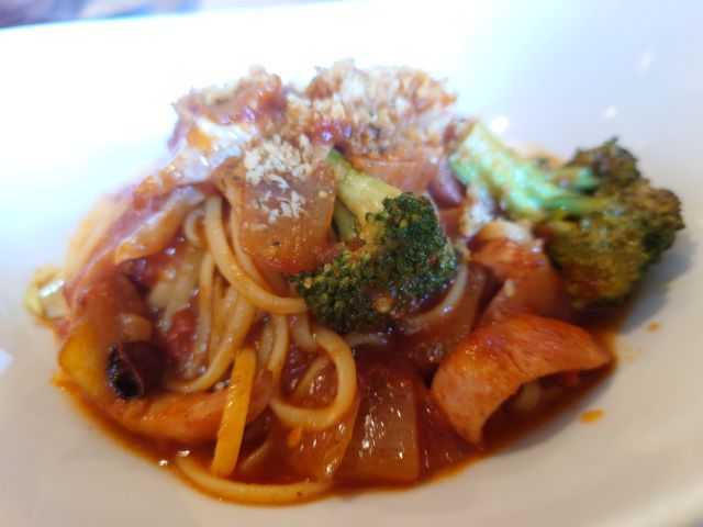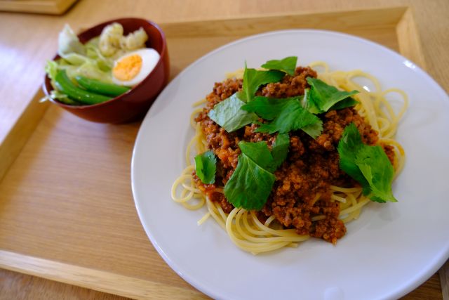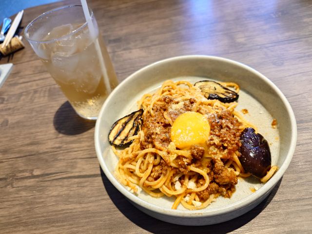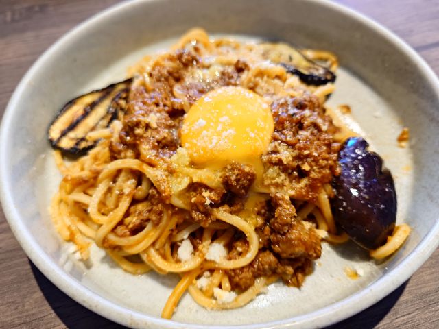 パスタはボロネーゼをチョイス、ひき肉の粒が大きく香味野菜とのバランスが良いですね、さすが自家製です。具材の千両なすが美味、チーズ・卵黄醤油漬けも濃厚で全体バランスも良かったです(*^^*)