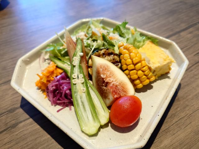 注文は生パスタランチ、最初に前菜がやって来ました! 品数多いですね、どれも一工夫されており素材の良さを活かした味わい、キッシュ・無花果・玉蜀黍が特に好みの味わいでした。