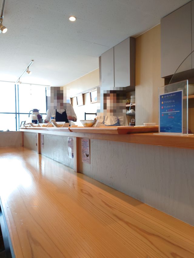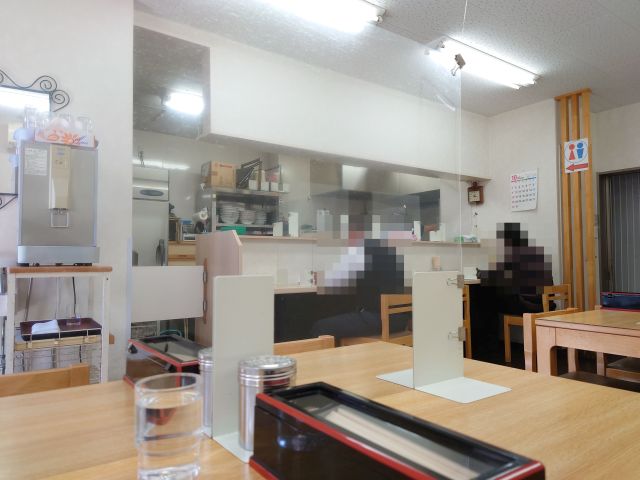店内は奥に長い空間、4人掛けテーブル席が整然と列んでいます! 厨房は一番奥側、13時過ぎで先客さんなし、店主さん・スタッフさんものんびりされておられます。