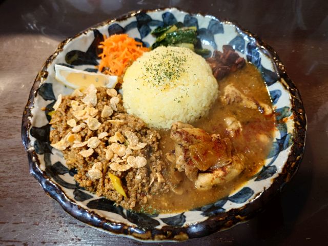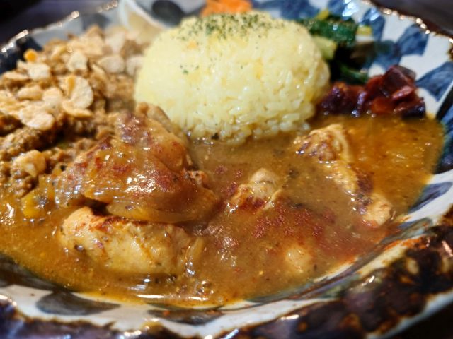右は和出汁チキンカレー、節系を含む和風出汁で優しい味わいですね、鶏肉も大きめです。和出汁とスパイスの両立はバランスが重要だと思いますが完成度かなり高いと思います。左がドライキーマカレー、大粒のひき肉で食べ応えあります。豪快で肉肉しいキーマカレーですが檸檬を絞るとさっぱり頂けますよ、お勧めです。
