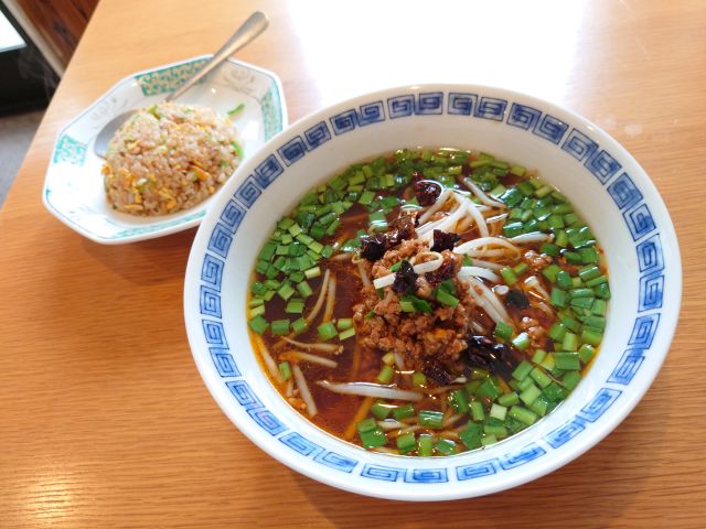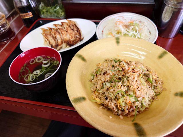 注文は「チャーハン餃子定食(900円)」、待つこと10分少々でやって来ました。メインの他にサラダとすまし汁が付いています。
