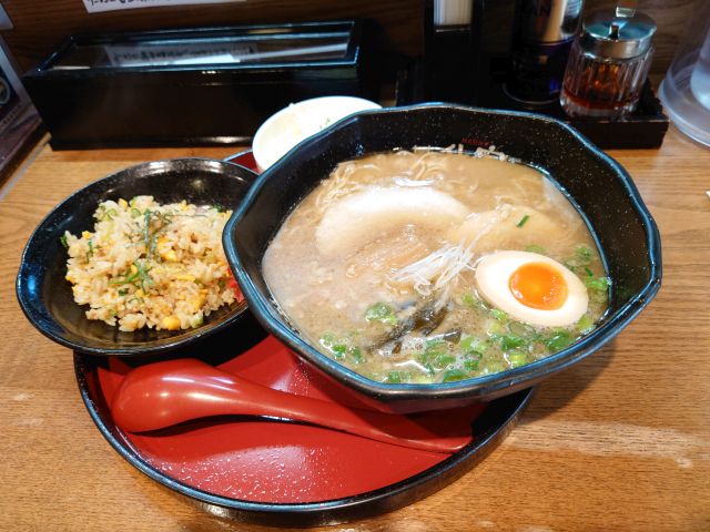 チャーハンはパラパラ系ですね、醤油系タレなので色は濃いめですが辛くはありません、私的にはチャーシュー片が多ければ有り難いです^^ 餃子は小さめですが数でカバーしています、焼目しっかりですが薄皮で食べやすいです、麺類との相性も良さげに思います。この組み合わせで900円はリーズナブルだと思います(*^^*)