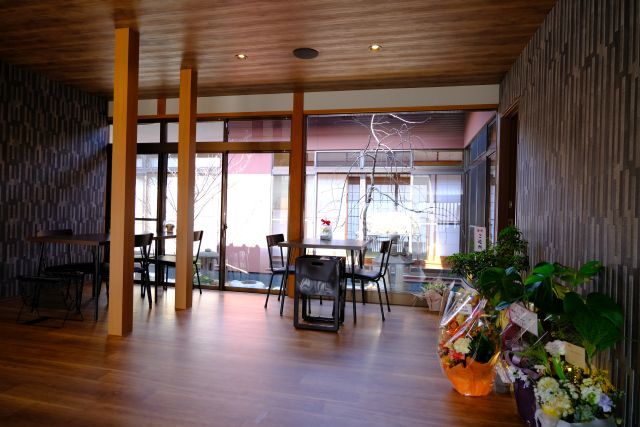 玄関で靴を脱ぎ左手側のテーブル席へ入ります! 奥には和室が4間、レンタルスペースなので借りることが出来るそうです。中庭には枝垂れ桜もあって、今月末には楽しめそうですね。