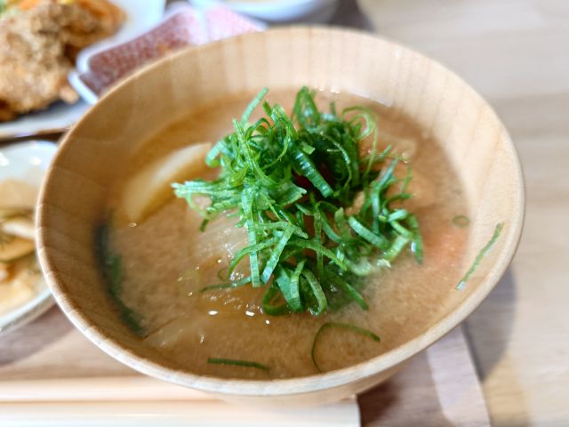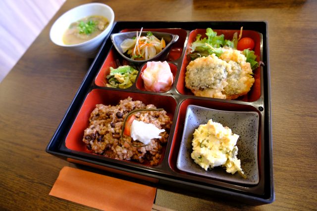注文は和みランチ(1500円)、待つこと10分少々でやって来ました。重箱形式でマス目には手の込んだおかずがしっかり、豚汁も付いています!!