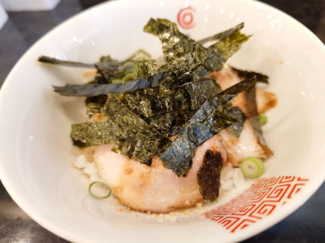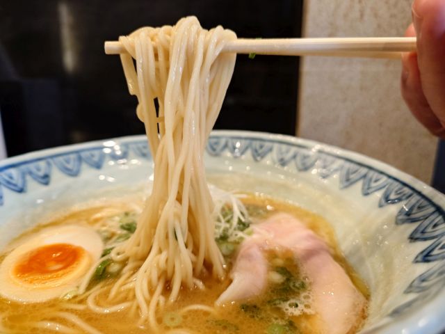 麺は中細ストレート、普通指定で良い感じ、加水は若干高めの印象。チャーシューは脂バランスの良い細長仕様が沢山、食べ応えある枚数。他の具材は細もやし・細シナチク・青ネギになります。