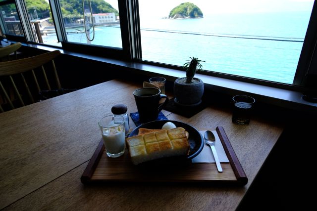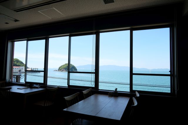 南側の窓からは風光明媚な瀬戸内海を遮るものなく眺められますね、岡山県南の海カフェさんでは3本指に入る絶景、小島や航行する船舶をのんびり眺めるには最適です^^ 目の前の小島は手影島、鳥居と神社があり、潮が引いた時には陸続きになるそうです!!