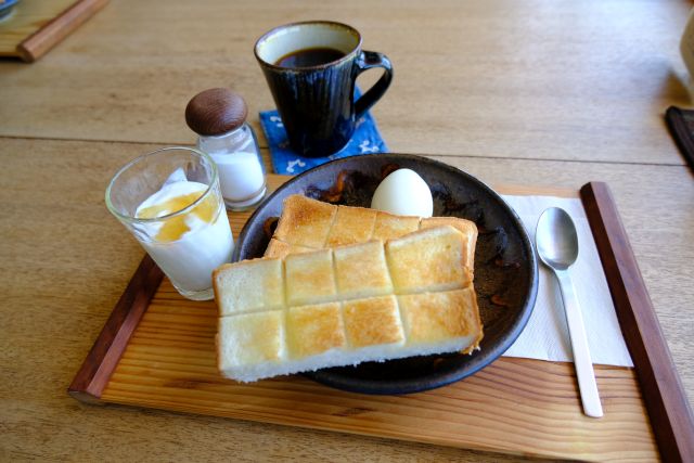 早い時間帯でしたのでモーニングセット(500円)を注文、10分弱で到着、トーストは食べやすいように細かく切れ目が入れてありますね。ゆで卵とヨーグルト付き。珈琲は癖のないブレンド、モーニングに最適な組み合わせです。