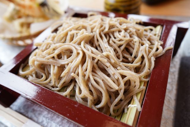 注文は「天盛りざる」、待つこと15分ほどでやって来ました。蕎麦は北海道産キタノマシュウ、石臼挽きで星が散見されます。丈は少し短めですが瑞々しい食感、喉越し良くスルスルと頂けます。つけ汁は濃いめですが辛くはなく蕎麦をしっかり引き立てます!!