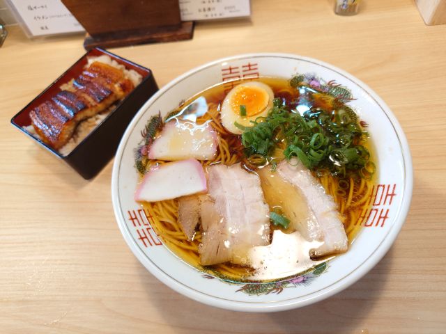 うな重はミニサイズですが一切れのサイズが大きいですね、LL級のうなぎです。網焼きされて余分な脂が落ちています。身は軟らかく、タレは濃いめ...鶏ガラ醤油ラーメンとの相性もバッチリです(*^^*)