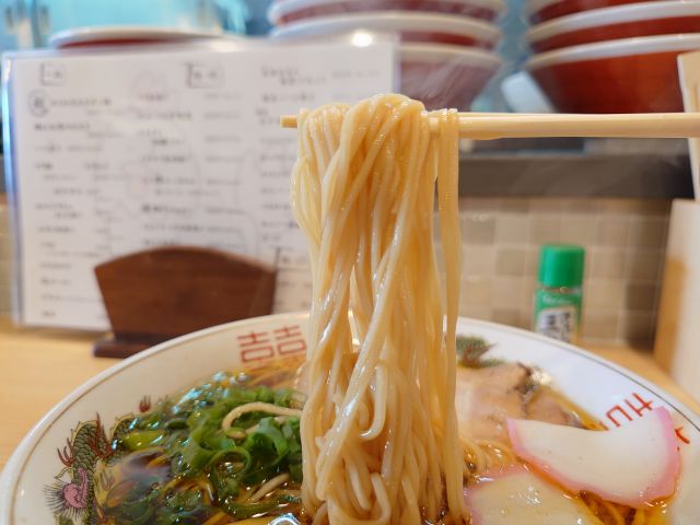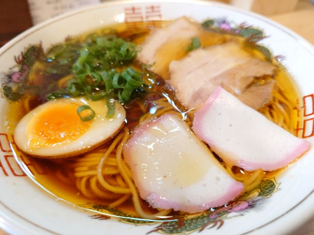スープは綺麗に澄んでいますが鶏ガラの旨味がしっかり、鶏油多めで濃厚な味わいです。麺(冨士麺さん謹製)は中細ストレート、加水率低めでスープをしっかり持ち上げます。チャーシューは厚みがしっかりあり、脂バランスも良好です。他の具材は味玉半身・蒲鉾・青ネギになります。