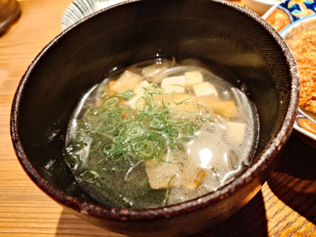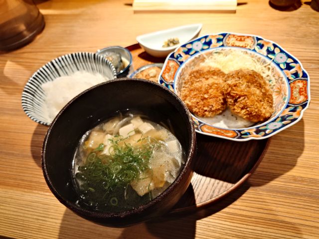 注文は「メンチカツ定食(1500円)」、店主さんの無駄のない動きを感心しながら眺めます。待つこと10分少々で配膳、汁椀がでかいです^^; (ご飯は大中小選択できます)