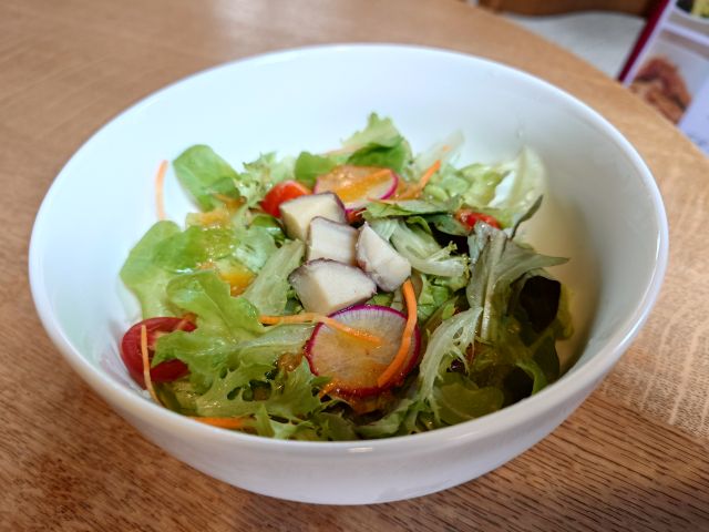 注文は「海老とホタテのトマトクリームパスタ(1500円)」、本日限定のパスタになります。最初にサラダ、10分少々でパスタもやって来ました、サラダは大きなボウル皿で登場です。