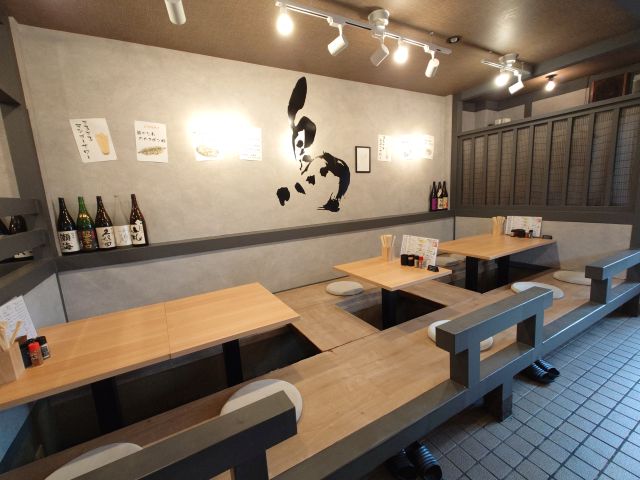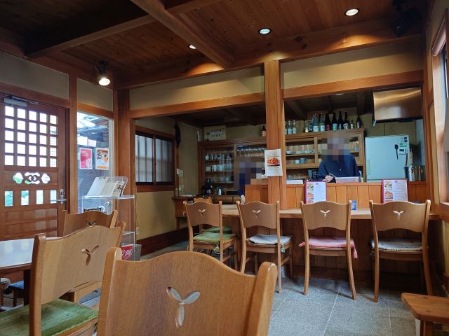 店内は奥に長い空間、厨房前のカウンター席と向かいの小上がり席、奥にはテーブル席もあります。