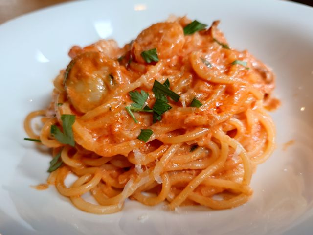 中サイズの海老と帆立がしっかり入っていますね、最初に爽やかなトマトソースの風味ありますが、後からクリームの濃厚さが口中に広がります。見た目よりパンチのあるトマトクリームソース、具材バランスも良く最後まで美味しく頂きました(*^^*)