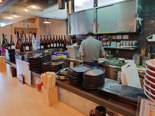 店内は奥に長い構造、カウンター席のみ6席です。おひとり様なのでカウンター席端っこに入ります、料金は前払いになります。