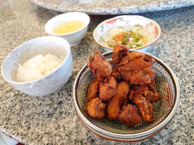 メインは豚肉とトマトのスープ、台湾風名称も付いていますのでほんのり香草が効いています、素材の旨味がしっかり溶け込んでシンプルながらも好みの味わいになっていました。揚げ物は白身魚とさつまいもの天ぷら、どちらも美味しかったです。